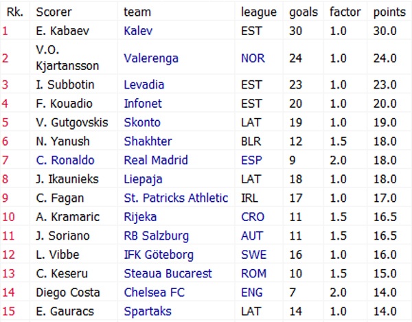 5 vị trí tiếp theo thuộc về V.O. Kjartansson (24 điểm, CLB Valerenga, Na Uy), I. Subbotin (23 điểm, CLB Levadia, Estonia), F. Kouadio (20 điểm, CLB Infonet, Estonia), V. Gutgovskis (19 điểm, CLB Skonto, Latvia), N. Yanush (12 điểm, CLB Shakhter, Belarus). Đây là những cầu thủ còn ít cơ hội cạnh tranh, bởi các giải đấu chuẩn bị khép lại.