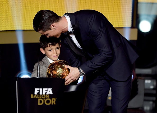 | Ronaldo không quên chia sẻ danh hiệu cao quý với cậu quý tử Cristiano Ronaldo Jr... |