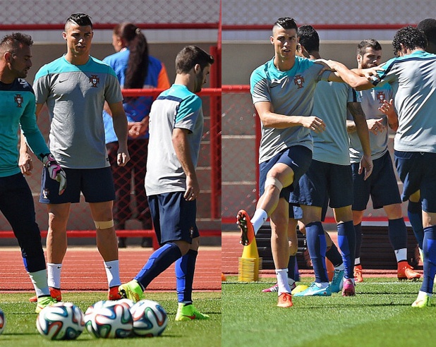 | Trong buổi tập gần nhất của ĐT Bồ Đào Nha nhằm chuẩn bị cho trận đấu sống còn với Ghana, rất nhiều người bất ngờ khi chứng kiến Ronaldo ra sân với kiểu tóc mới. |