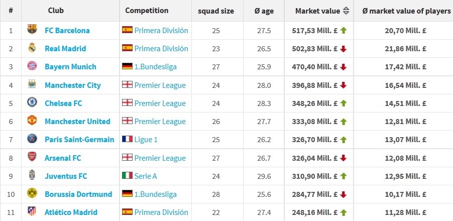 | 11 CLB có đội hình đắt giá nhất thế giới. |