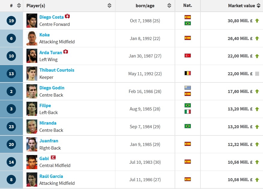 Với Atletico, họ chỉ có duy nhất 1 cầu thủ trên 30 triệu bảng là Diego Costa (30,8). Dẫu vậy khả năng ra sân của chân sút gốc Brazil ở trận chung kết là không cao, bởi anh đang trong quá trình điều trị chấn thương gân khoeo. Nếu Costa không thi đấu thì giá trị đội hình trên sân của Atletico sẽ giảm rất mạnh.