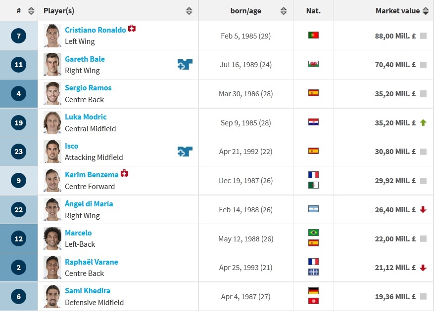 Trong danh sách của Real, 1 cầu thủ có giá trên 80 triệu bảng là Cristiano Ronaldo (88 triệu), 1 cầu thủ trên 70 triệu bảng là Gareth Bale (70,4 triệu), 3 cầu thủ trên 30 triệu bảng gồm Sergio Ramos (35,2), Luka Modric (35,2) và Isco (30,8). Như vạy, riêng giá bộ đôi siêu sao Ronaldo và Bale đã chiếm 2/3 giá trị của Atletico (158,4 so với 248,16).