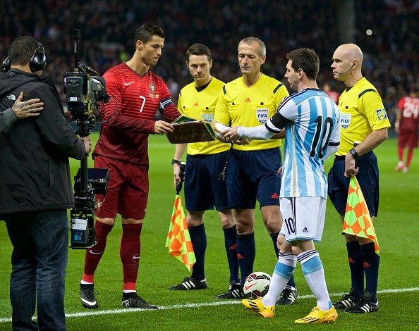 | CR7 và Leo tỏ ra thân thiện trong lúc tiến hành làm thủ tục bắt đầu trận đấu. |