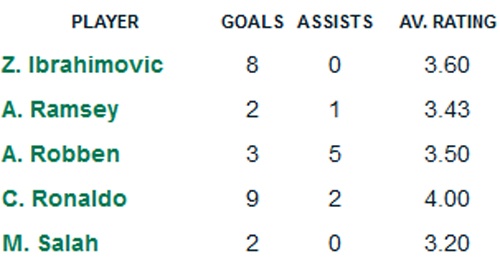 Vị trí thứ 3 trong danh sách xếp hạng của trang bóng đá số 1 thế giới thuộc về tiền vệ Robben (Bayern). Sau 4 trận ra sân, tuyển thủ người Hà Lan thực hiện 3 pha lập công cho Hùm xám xứ Bavaria. Đây là thành tích rất ấn tượng đối với một cầu thủ đá cánh. Sau khi vòng bảng Champions League khép lại, Robben nhận điểm trung bình 3,5.