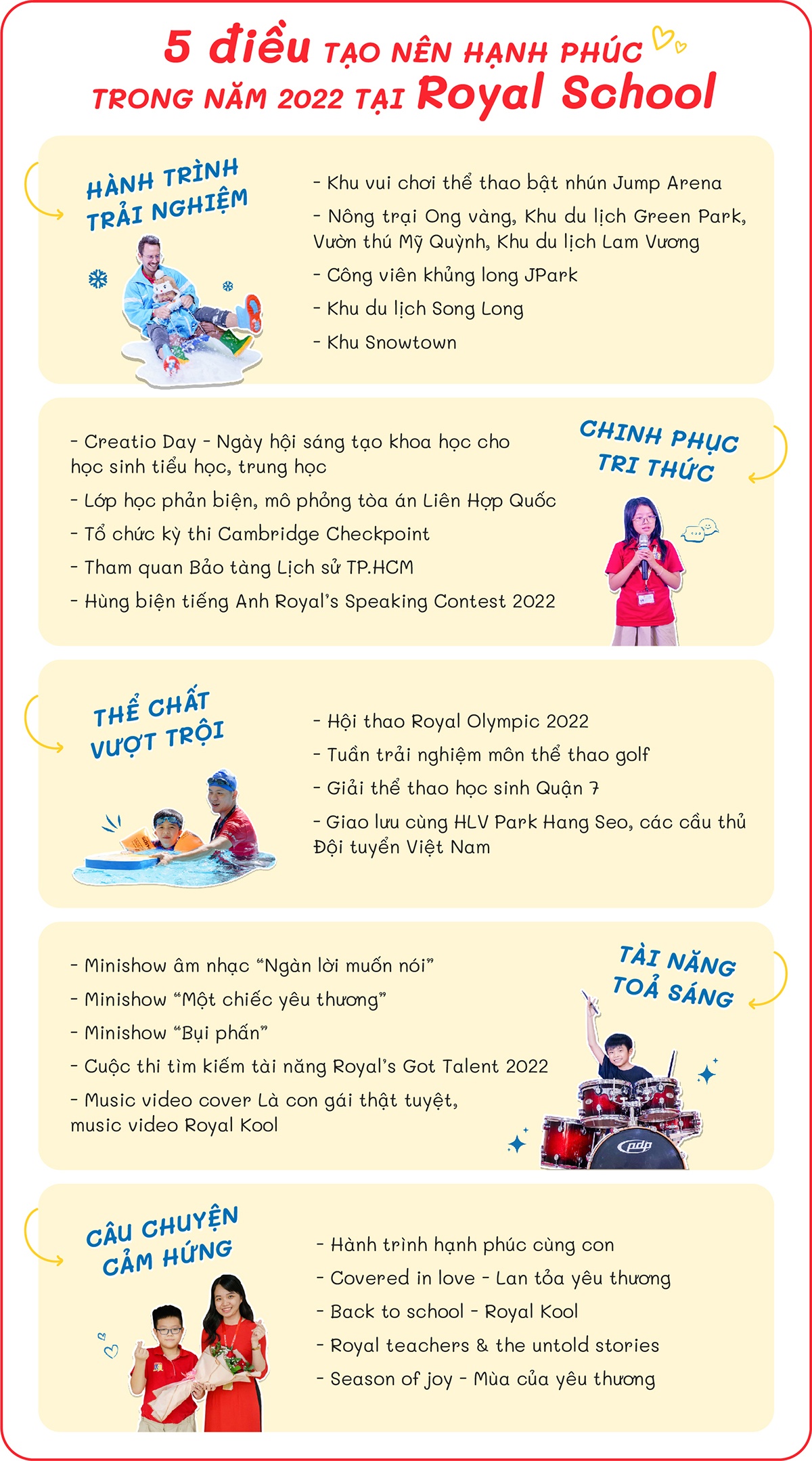 Với thành tích thi đua học tập nổi bật và những phản hồi tích cực từ phía học sinh, phụ huynh đối với công tác giáo dục tại trường, Royal School đã thành công tạo dựng trường học hạnh phúc trong năm 2022.