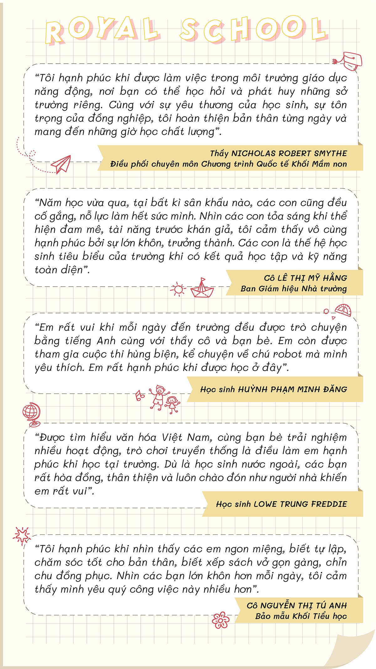 Năm qua, Royal School đã gặt hái được nhiều thành công từ nỗ lực xây dựng trường học hạnh phúc - nơi mỗi bước trưởng thành của học sinh đều có sự đồng hành và gắn kết của thầy cô, ba mẹ và bạn bè.