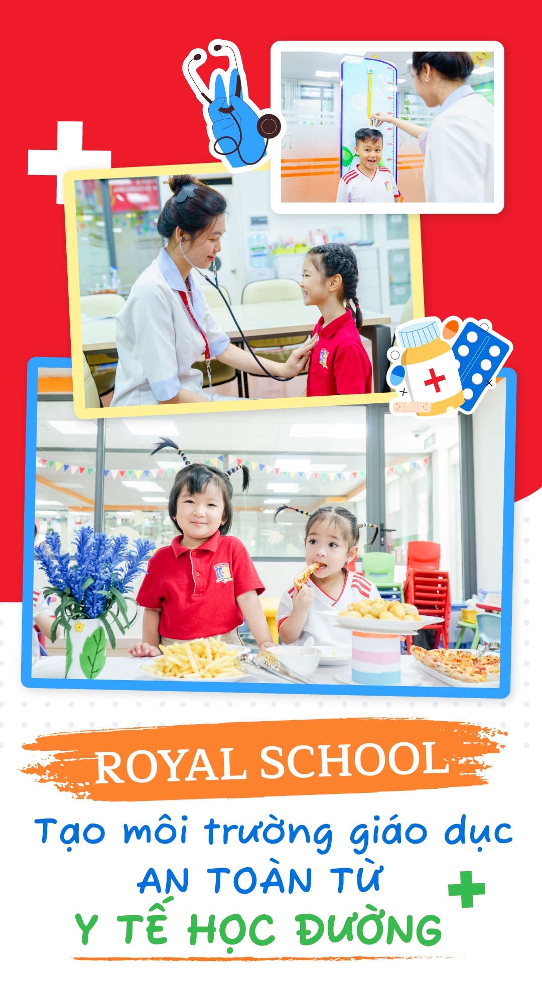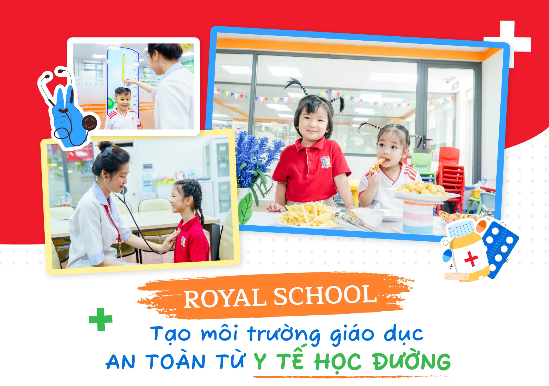 Không phải yếu tố quyết định thành tích học tập của học sinh nhưng y tế học đường giữ vai trò quan trọng trong suốt những năm tháng đến trường. Từ bậc mầm non đến trung học phổ thông, học sinh có sự thay đổi, trưởng thành khác nhau về thể chất và tâm sinh lý. Hiểu rõ điều đó, Royal School phối hợp chặt chẽ với đội ngũ y bác sĩ và phụ huynh đưa ra những hoạt động phù hợp, hướng đến xây dựng sức khỏe tốt nhất có thể cho học sinh.