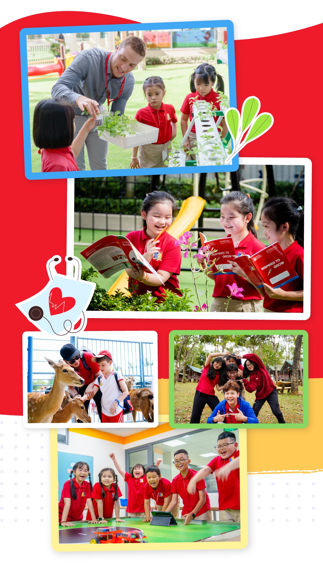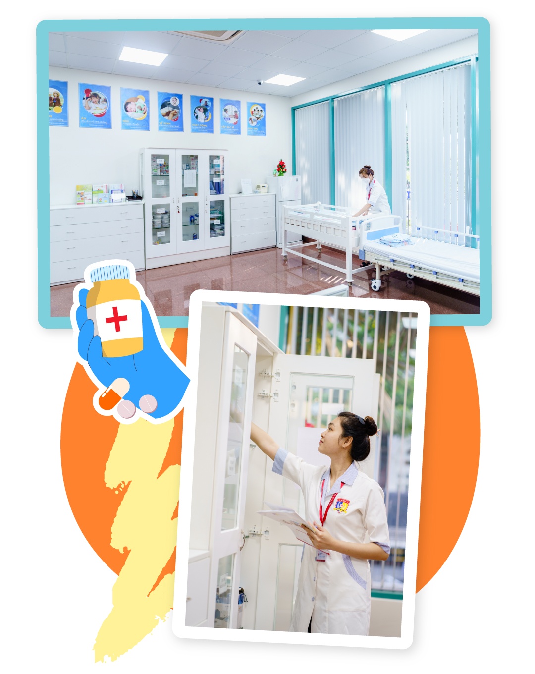 Cụ thể, trường đầu tư 2 phòng y tế với chức năng được thiết kế phù hợp cho từng cấp mầm non và phổ thông (gồm tiểu học, trung học cơ sở, trung học phổ thông). Các dụng cụ y tế, tủ thuốc, bảng thị lực, giường bệnh… được trang bị đầy đủ, đảm bảo an toàn và vệ sinh, đúng theo tiêu chuẩn quốc tế. Mỗi học sinh có sổ theo dõi sức khỏe riêng để ghi chú thông tin về quá trình phát triển thể chất trong thời gian theo học tại trường.