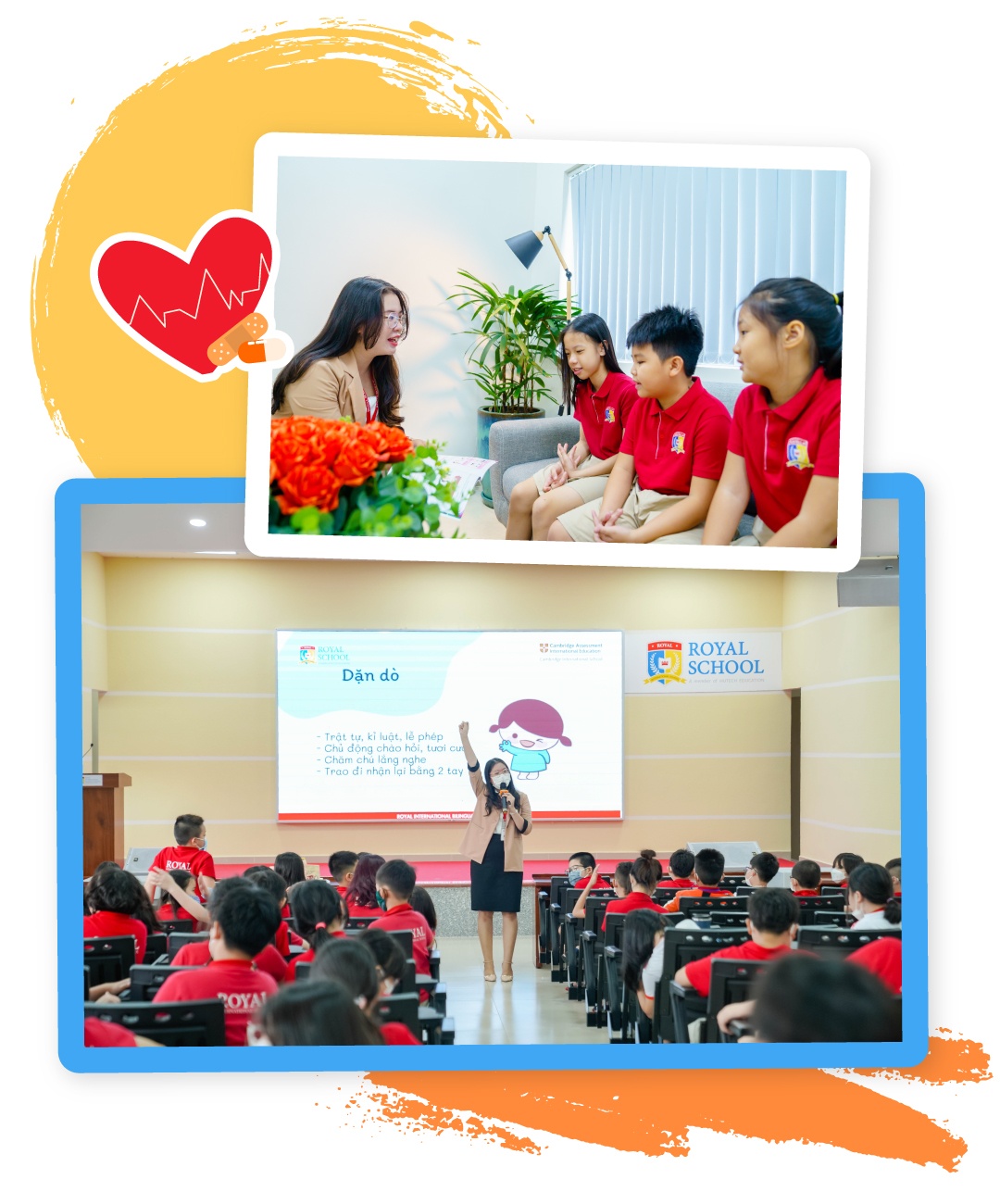 Cùng với đó, việc giáo dục ý thức tự giác bảo vệ sức khỏe, an toàn bản thân cho học sinh được Royal School chú trọng. Trường thường xuyên tổ chức nhiều buổi giáo dục, tuyên truyền cách phòng chống bệnh, tai nạn trong trường học, cách vệ sinh cá nhân đúng cách cho học sinh.