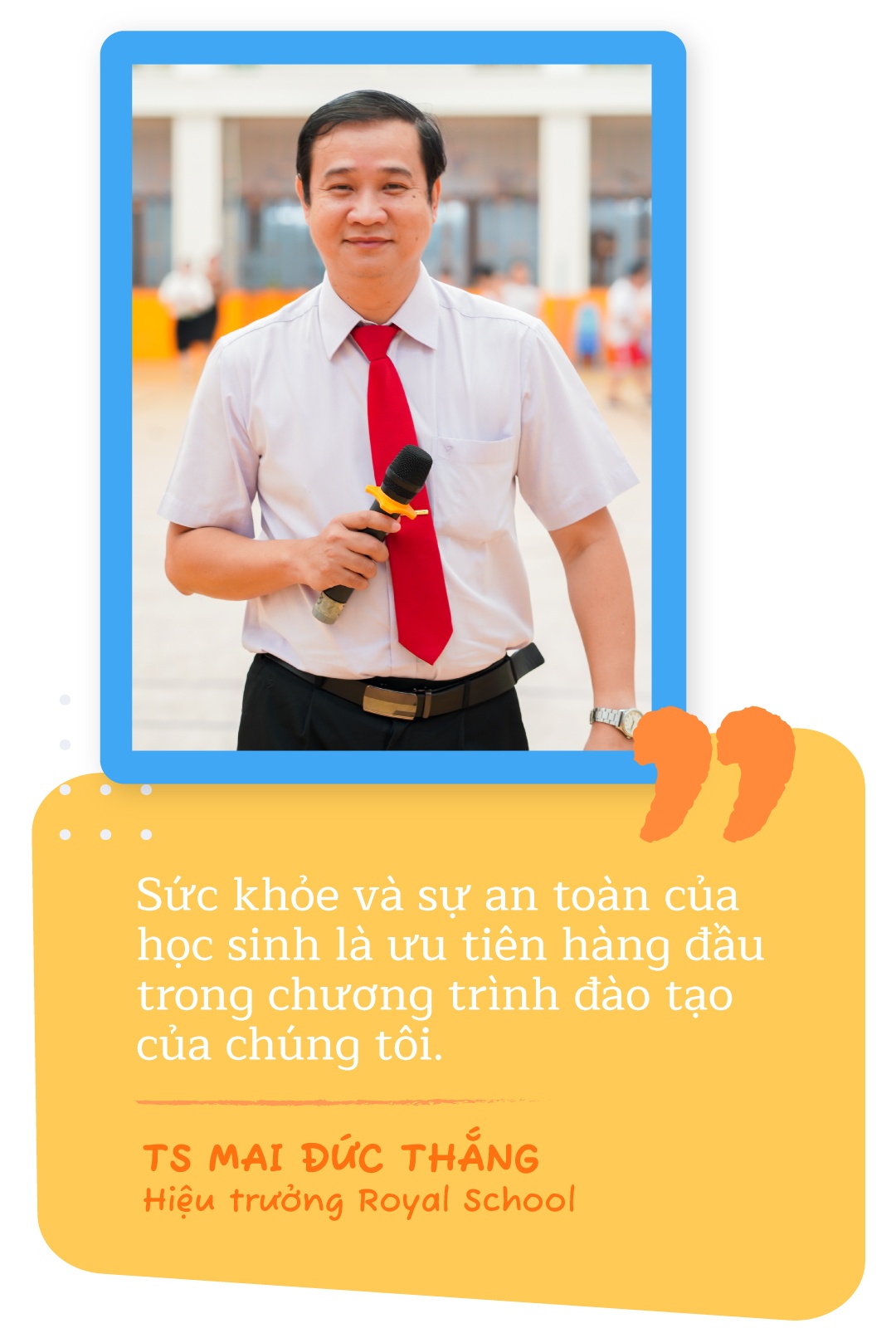 Theo TS Mai Đức Thắng - Hiệu trưởng Royal School, y tế học đường là một trong những nền tảng không thể thiếu để học sinh đạt được kết quả học tập tốt. “Royal School đáp ứng đầy đủ trang thiết bị y tế nhằm mang đến không gian học tập lành mạnh và tạo điều kiện lý tưởng cho hành trình khám phá tri thức của học sinh. Sức khỏe và sự an toàn của học sinh là ưu tiên hàng đầu trong chương trình đào tạo của chúng tôi”, TS Mai Đức Thắng nhấn mạnh.
