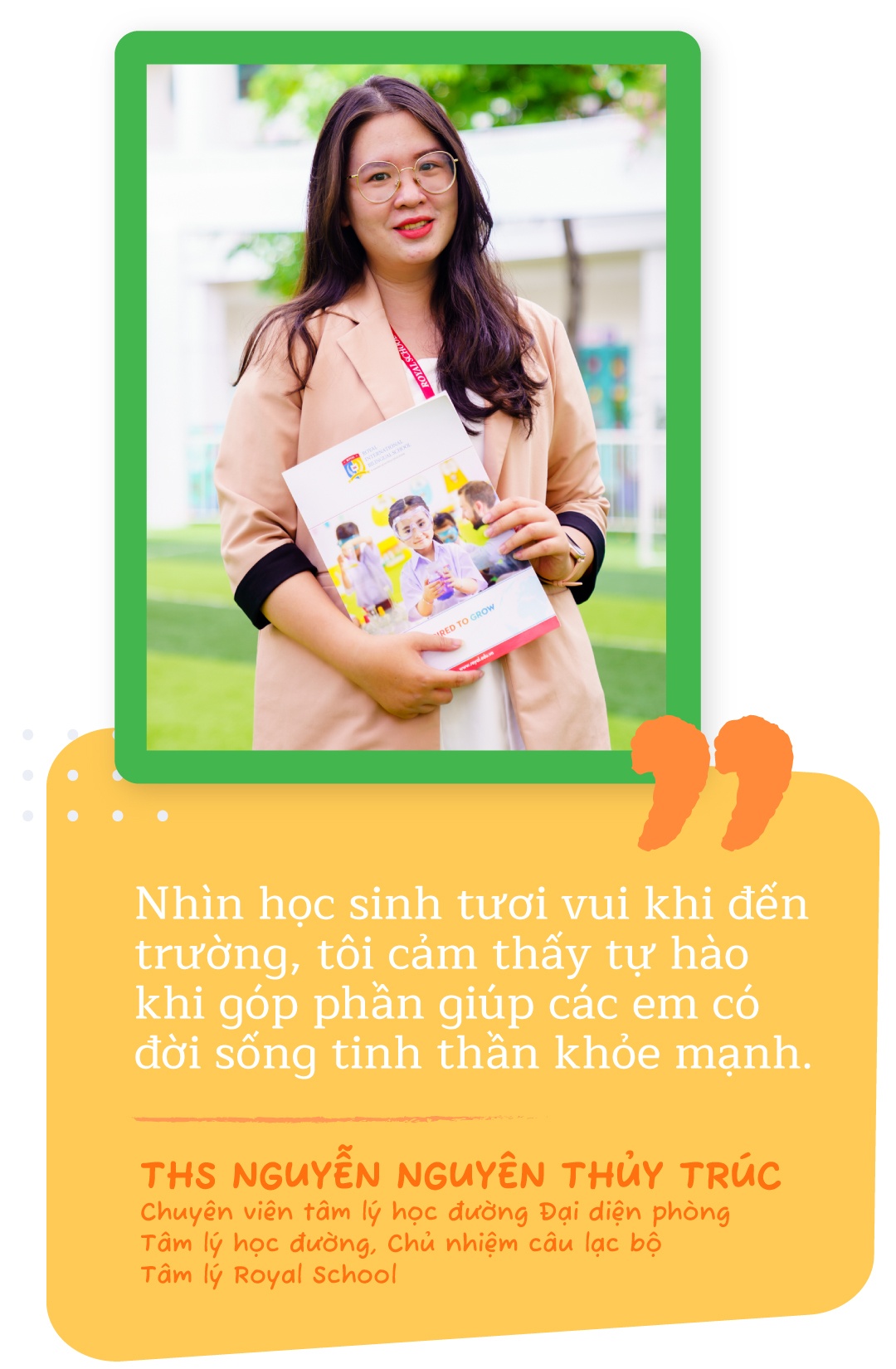 ThS Nguyễn Nguyên Thủy Trúc - chuyên viên tâm lý học đường - đại diện phòng Tâm lý học đường, chủ nhiệm câu lạc bộ Tâm lý Royal School - cho biết: “Tôi cảm thấy hạnh phúc khi được lắng nghe và đồng hành cùng học sinh giải đáp các vấn đề tâm lý tuổi học trò. Nhìn học sinh tươi vui khi đến trường, tôi cảm thấy tự hào khi góp phần giúp các em có đời sống tinh thần khỏe mạnh”.