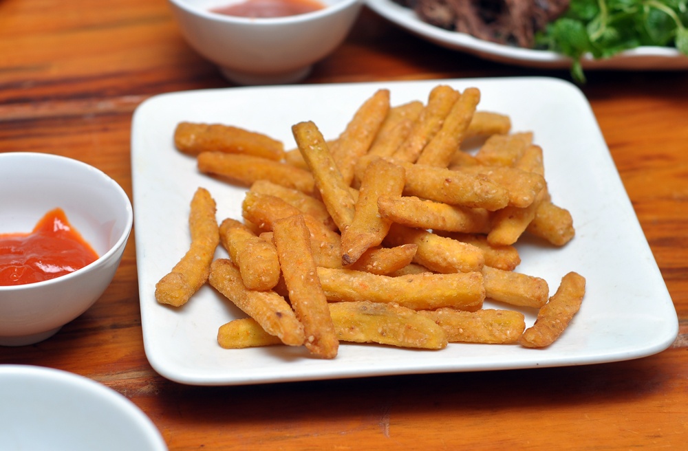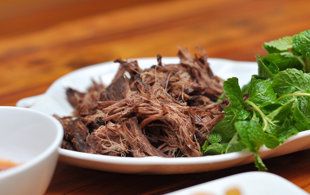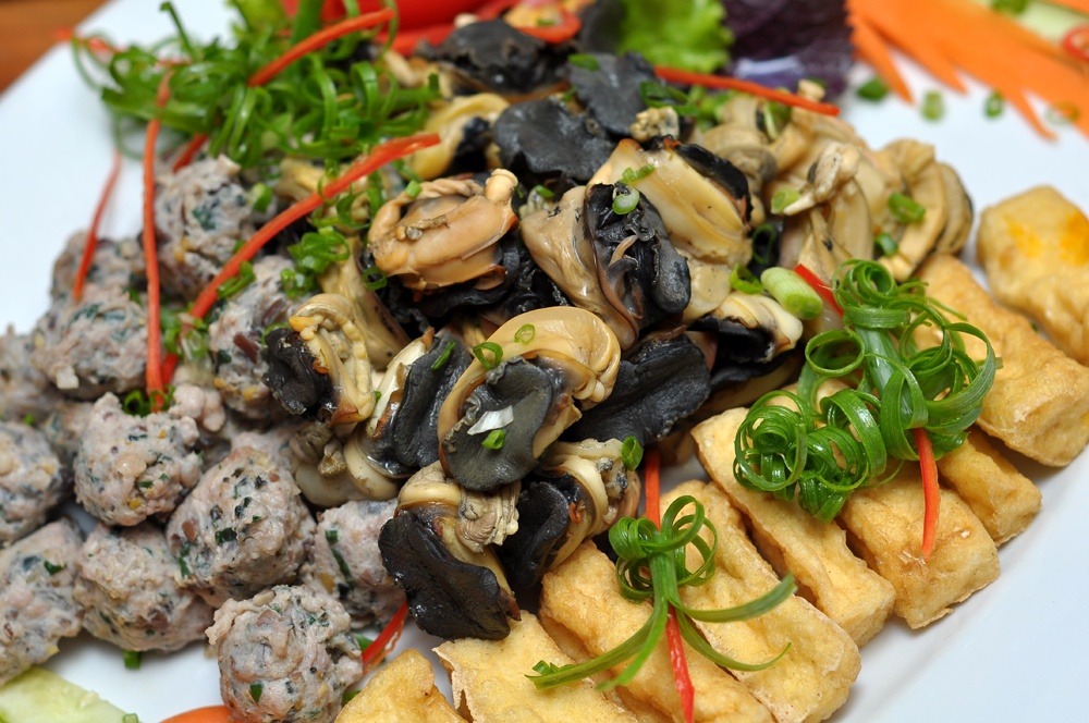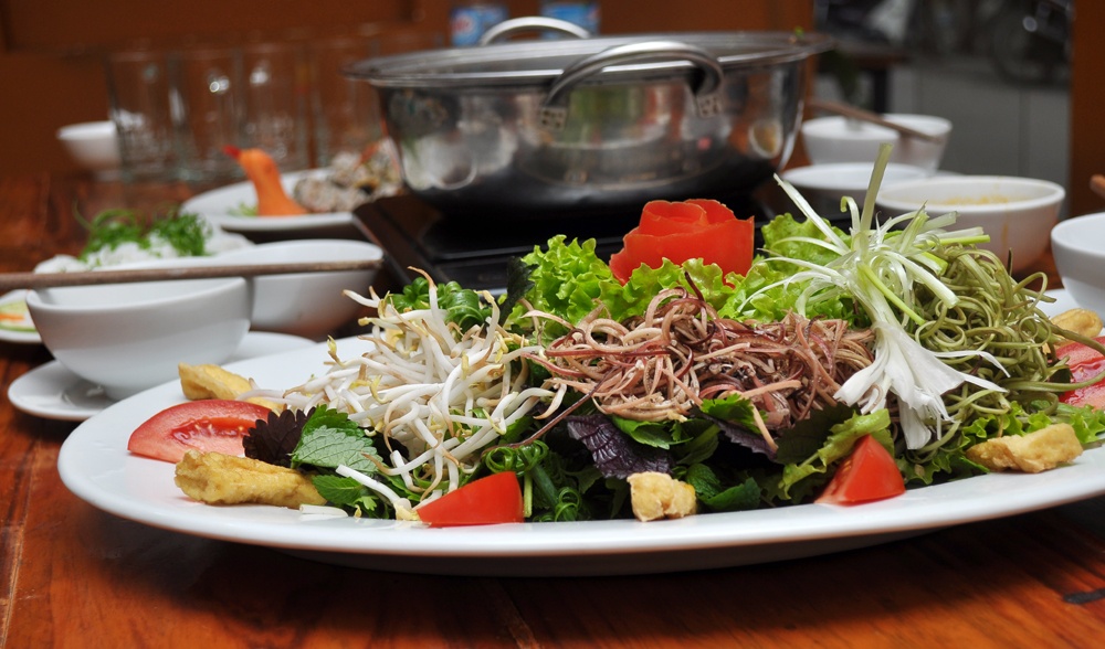 Rau muống chẻ, hoa chuối, tía tô... ăn kèm.