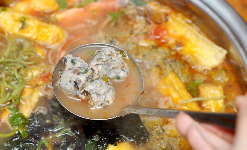 Có riêu cua ngọt chất nhưng nước lẩu lại chế biến thiên về vị chua thơm để hợp với ốc nhồi và mọc ốc giòn sần sật, hợp với mùa nóng đang đến gần của Hà Nội.