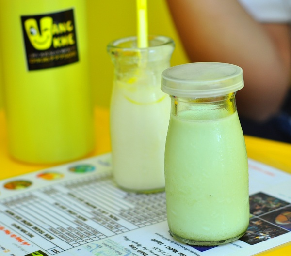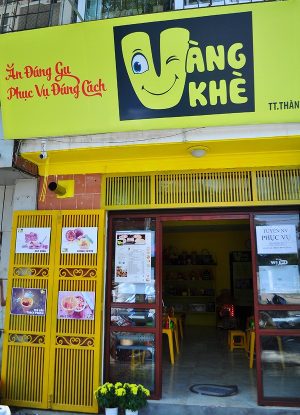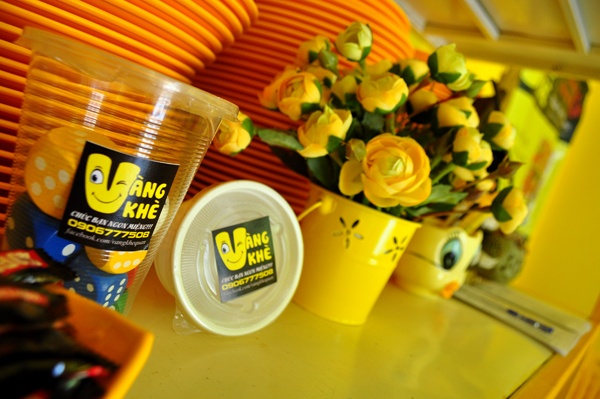 Cửa, hoa, khung ảnh, bàn ghế, nội thất… đều một màu “vàng khè” đúng cái tên “Vàng Khè Quán”. Sặc sỡ, rực rỡ - có lẽ đó là cách để tiệm gây ấn tượng, khiến các teen phải nhanh chóng chú ý đến mình. Nhưng không chỉ lối trang trí vui mắt mà thực đơn “độc lạ” mới là điểm cộng.