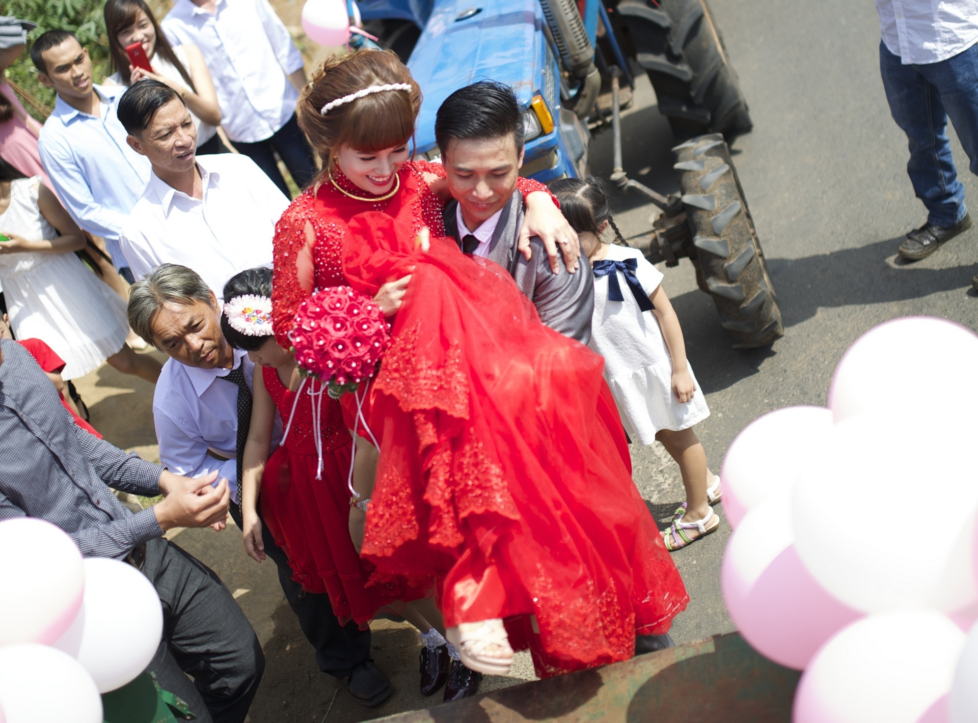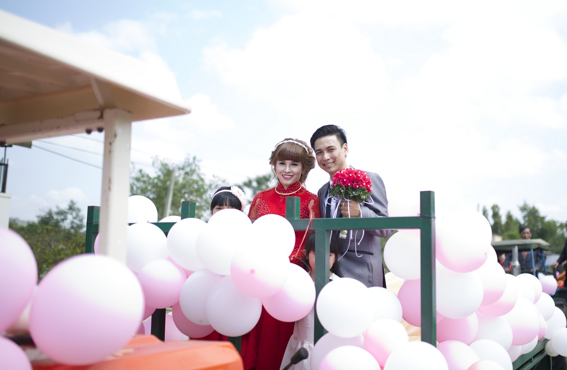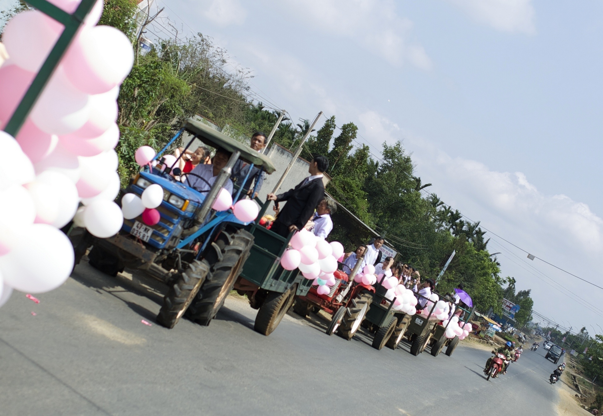 | Ngày 12/4, tại huyện Cư Kuin, tỉnh Đắk Lắk, nhiều người dân thích thú khi được chứng kiến một đám cưới độc đáo. Những chiếc xe sử dụng trong lễ rước dâu là máy cày, được trang trí bóng bay nhiều màu. |