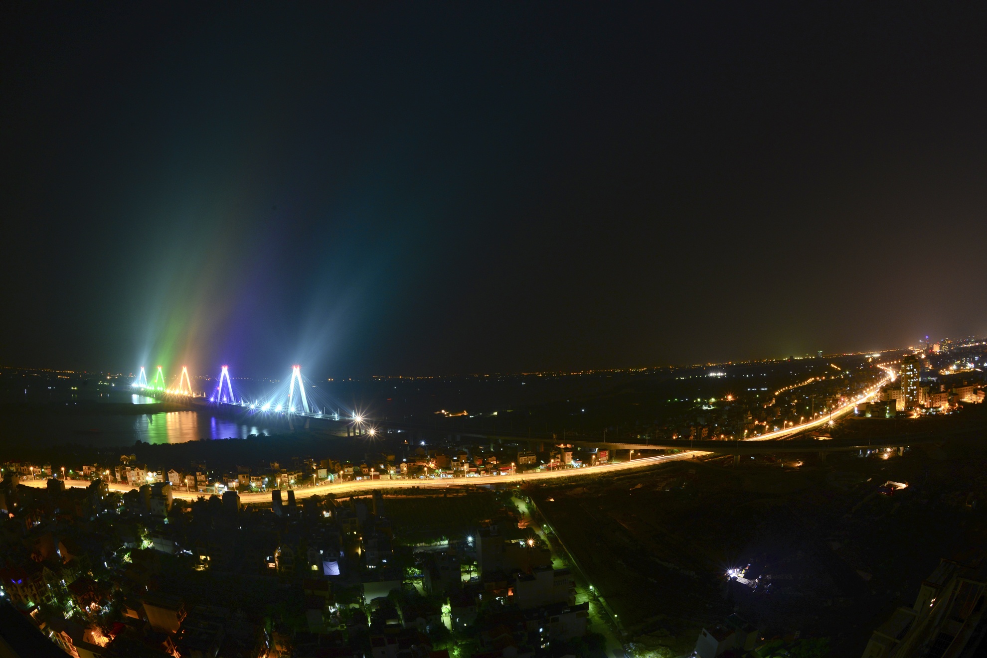 | Những ngày gần đây, người dân sống quanh khu vực phường Phú Thượng (quận Tây Hồ, Hà Nội) và xã Vĩnh Ngọc (huyện Đông Anh) ngỡ ngàng trước vẻ đẹp rực rỡ của ánh sáng phát ra từ cây cầu Nhật Tân. |