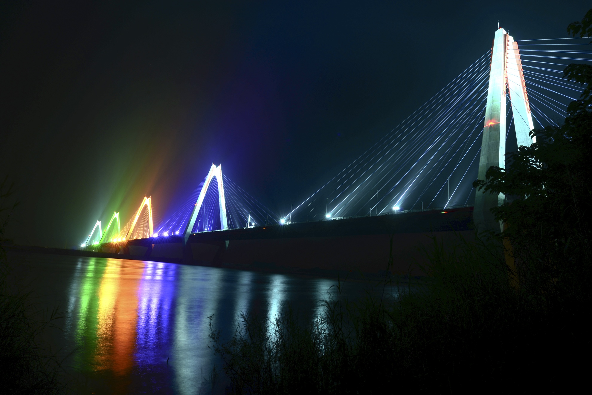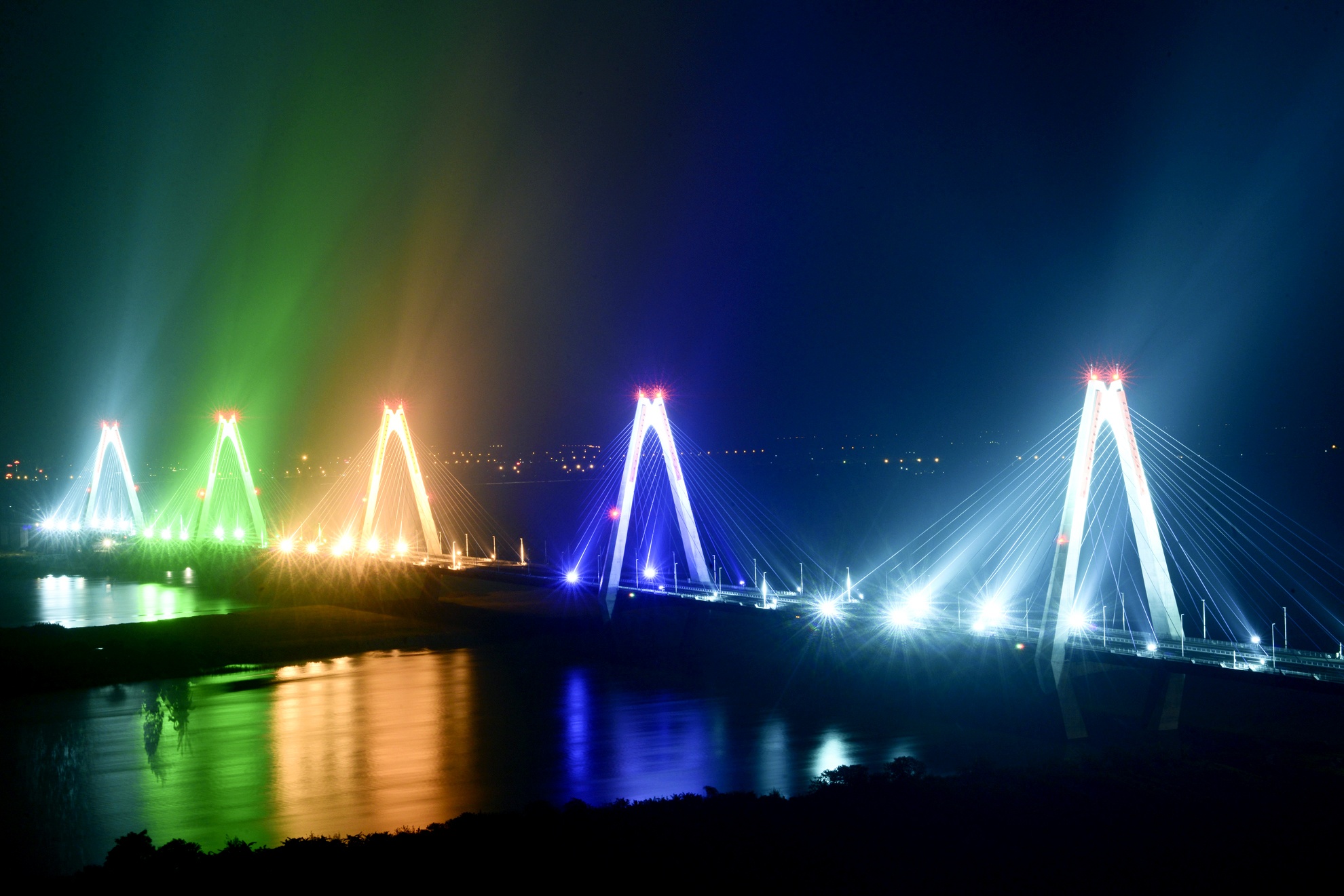 | Cầu được chiếu sáng 5 màu sắc khác nhau với 5 nhịp cầu chính rực sáng cả một khúc sông. Cầu Nhật Tân là một phần trong tổng dự án đường vành đai 2, tuyến giao thông đường bộ nội đô khép kín của Hà Nội có tổng chiều dài là 43,6 km. |
