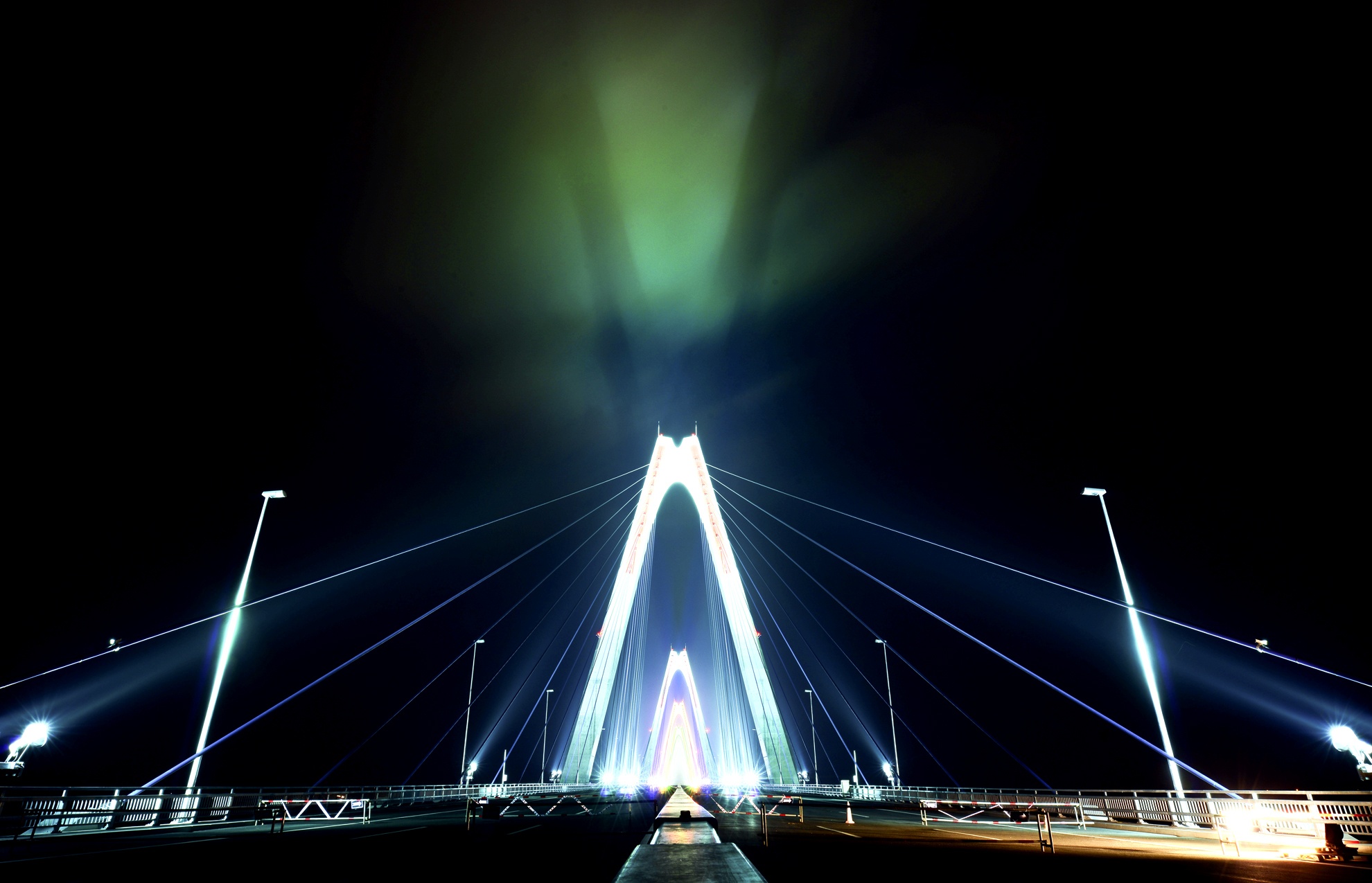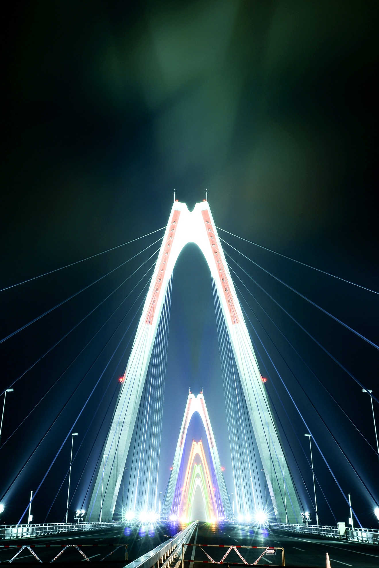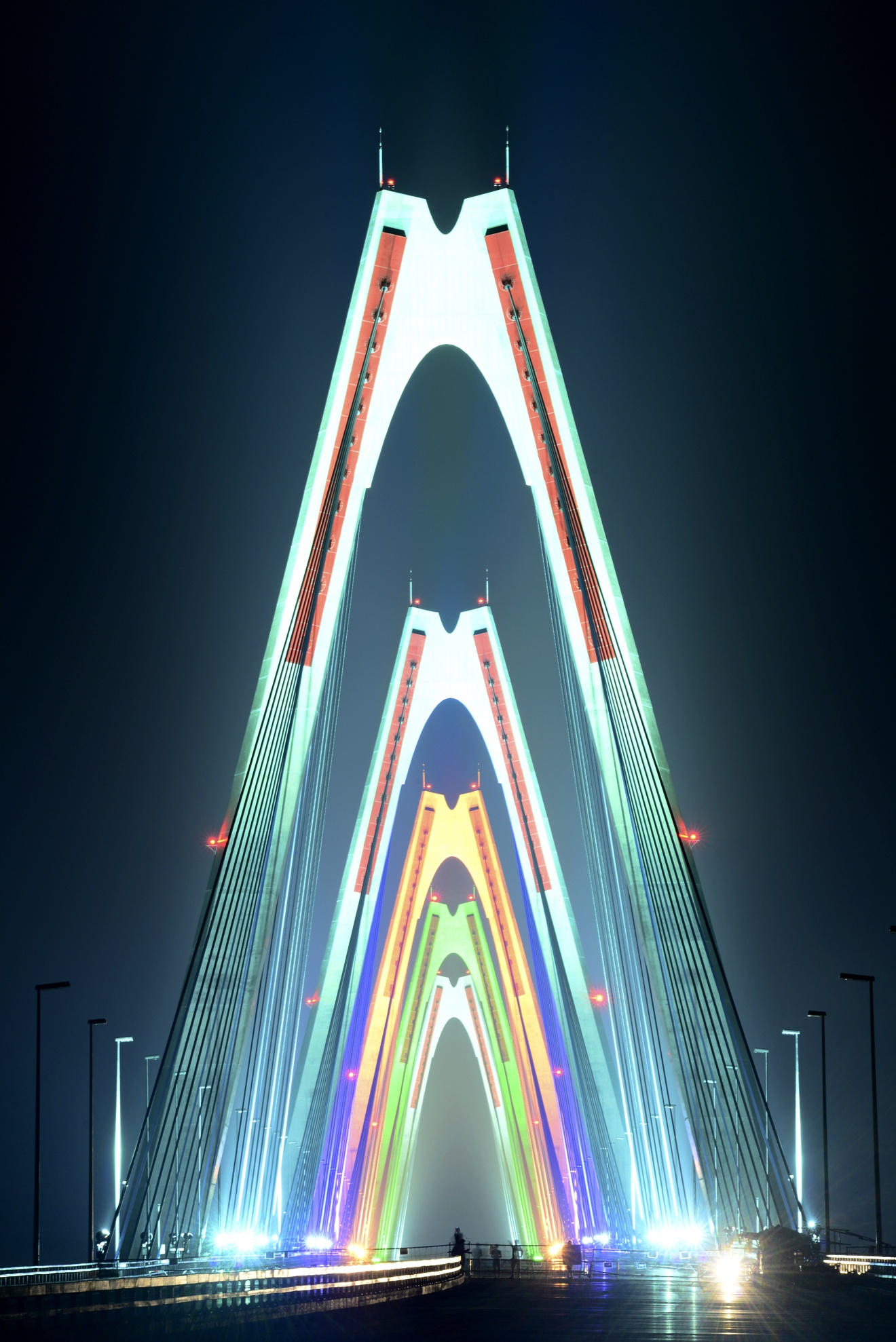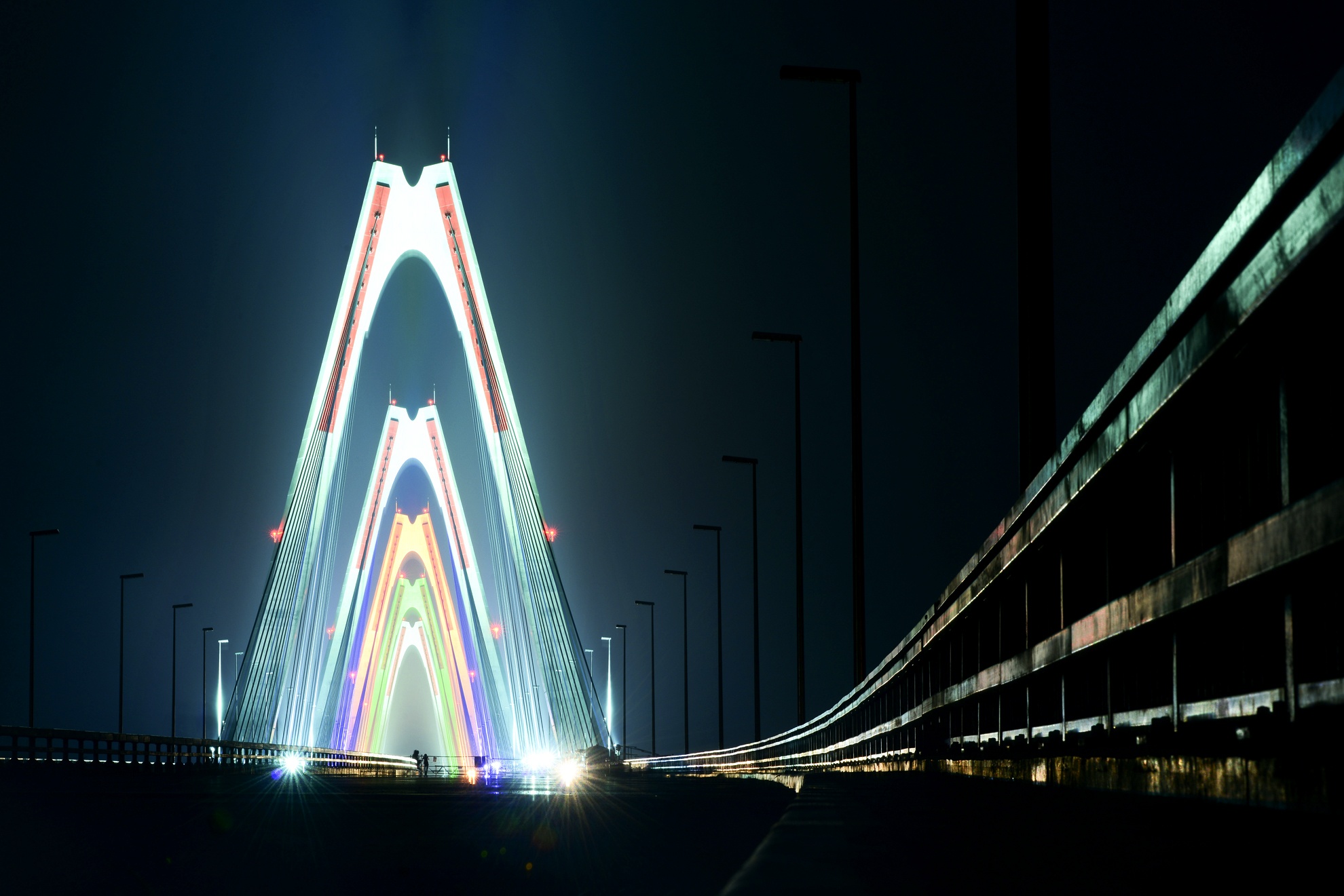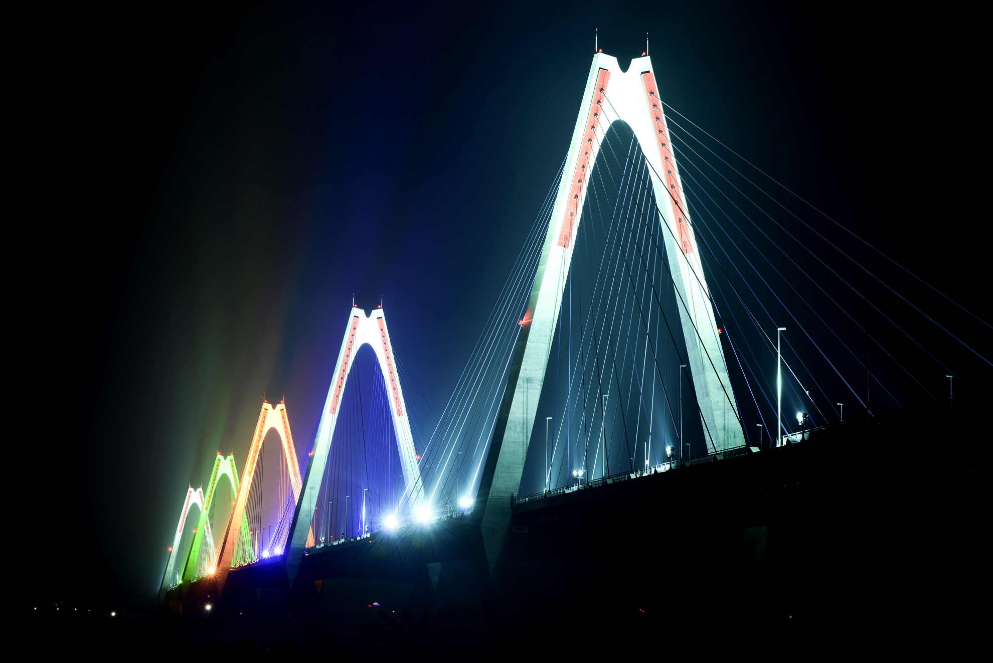 | 5 nhịp cầu sắc màu khổng lồ xếp dọc theo trục cầu tạo ra một hình ảnh rực rỡ trong đêm. |