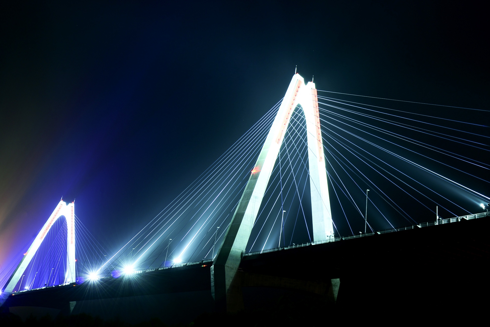 | Những đám mây trong đêm trôi qua đỉnh trụ cầu được chiếu sáng tô thêm vẻ đẹp cho quang cảnh khu vực này. |