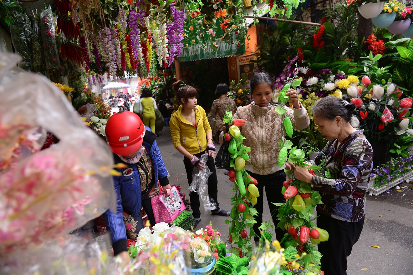 | Góc phố Hàng Chai tất bật người mua kẻ bán, những cành hoa, lộc giả vừa để trang trí vừa mang không khí xuân về nhà và cầu may mắn cho năm mới. |
