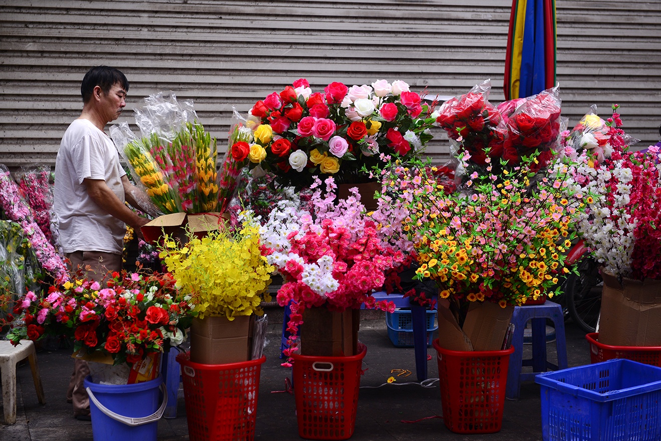 | Chợ hoa giả đầu Hàng Lược cũng đã bắt đầu rực rỡ khoe sắc trong những ngày cuối năm. |