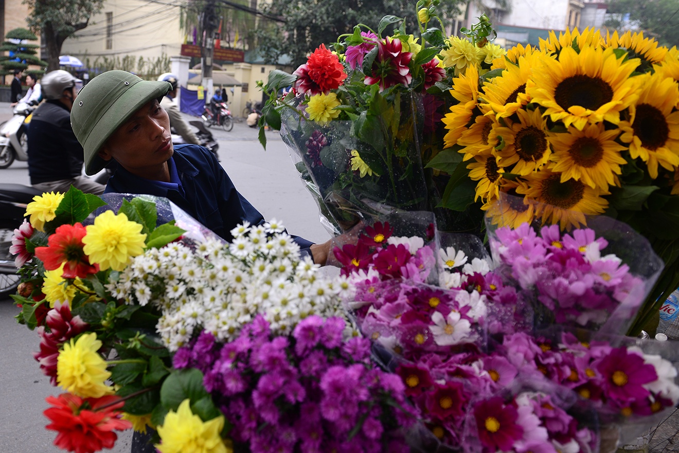 | Anh Thành, một người bán hoa rong cho hay nhu cầu chơi hoa dịp sát Tết của người dân khá lớn và họ không chỉ mua hoa đào mà còn chơi các loại hoa khác như thược dược, hướng dương, lay ơn... Mỗi ngày anh lấy hơn 1 triệu tiền hoa đến chiều là hết hàng về nghỉ, chuẩn bị cho ngày hôm sau. |