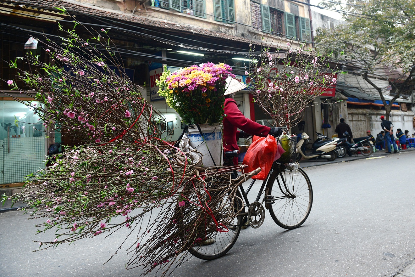 | Những gánh hoa xuân với những cành đào đỏ thắm đã dần xuất hiện trên các ngõ phố của Thủ đô. |