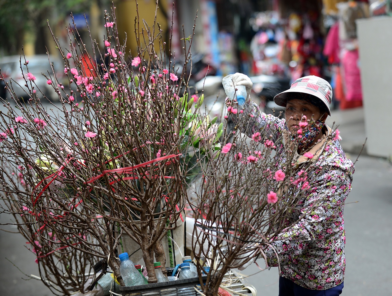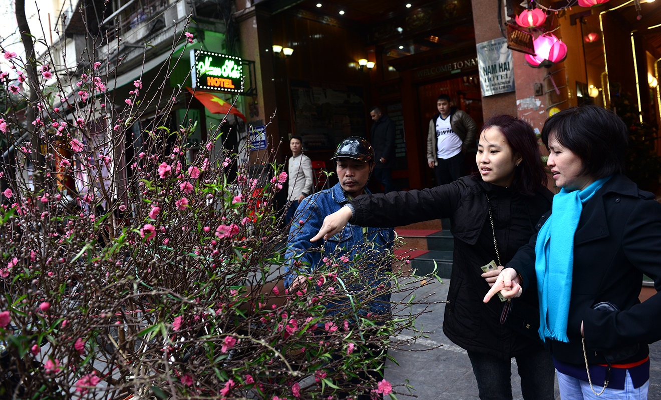 | Theo chị Chinh, một người bán đào sống tại làng hoa Nhật Tân thì thời tiết năm nay khá ổn định, hoa đào rất đẹp. Mỗi sáng chị lấy hơn chục cành đào xuống phố bán, đến trưa là hết hàng. |