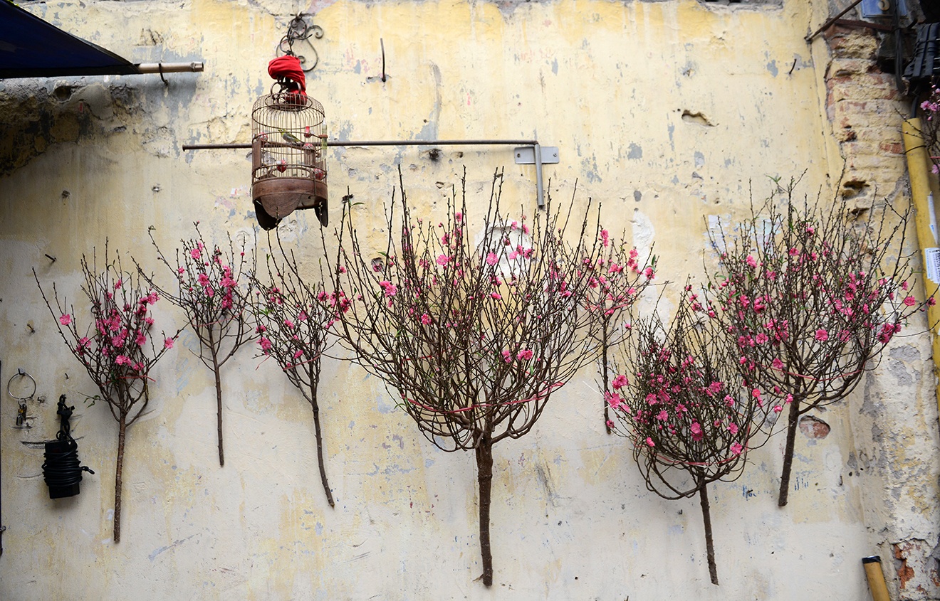 | Góc phố Hàng Rươi như một bức tranh xuân với những cành đào lớn nhỏ khoe sắc thắm. |