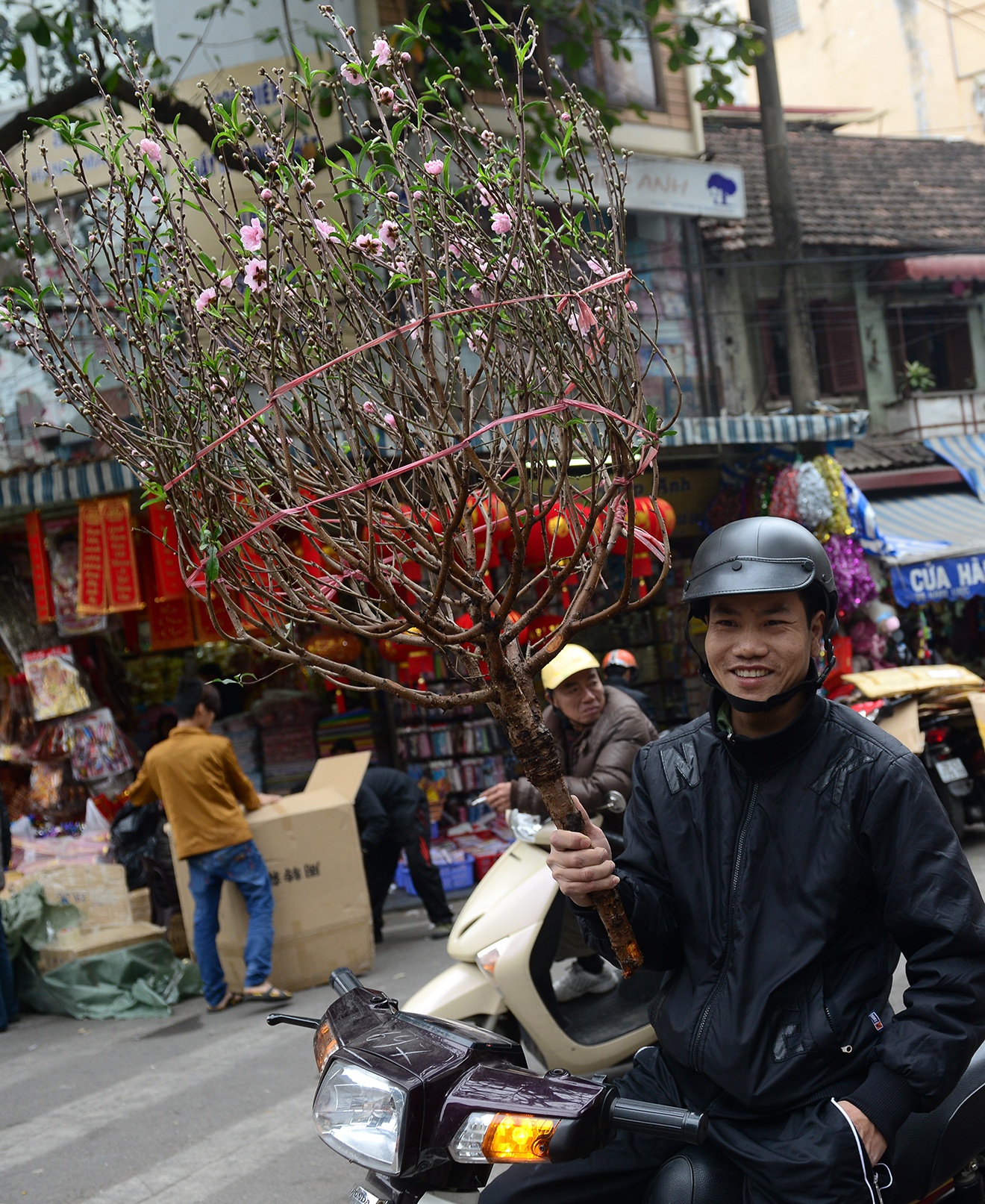 | Thời tiết Hà Nội đang chuyển lạnh, từng cành đào đỏ thắm xuống phố báo hiệu cho một mùa xuân nữa sắp về. |