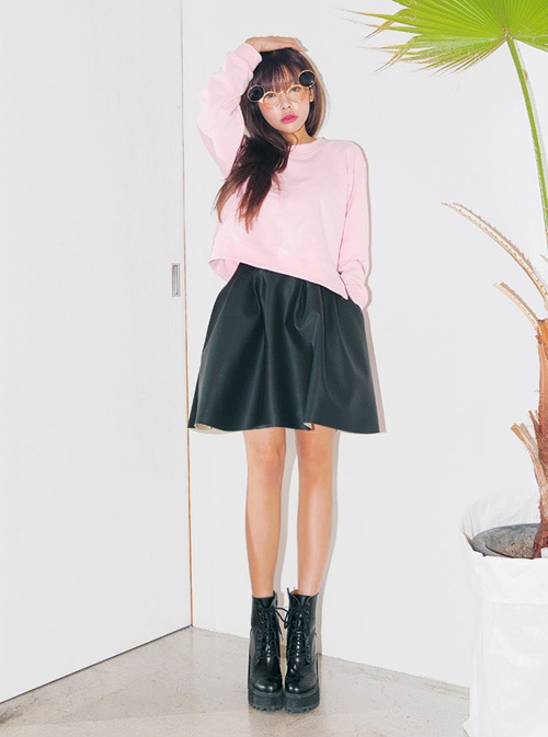 | Áo nỉ hồng dáng lửng cũng có thể dự tiệc khi mix kèm chân váy da sành điệu. |