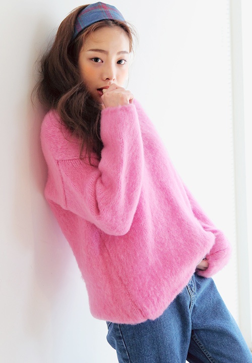 | Áo len lông hồng baby phối trẻ trung cùng quần denim. |