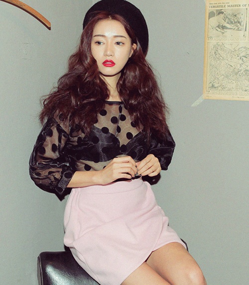 Tăng vẻ sexy với áo voan chấm bi và chân váy hồng phớt.