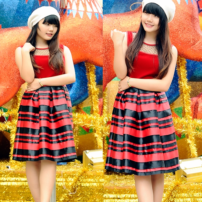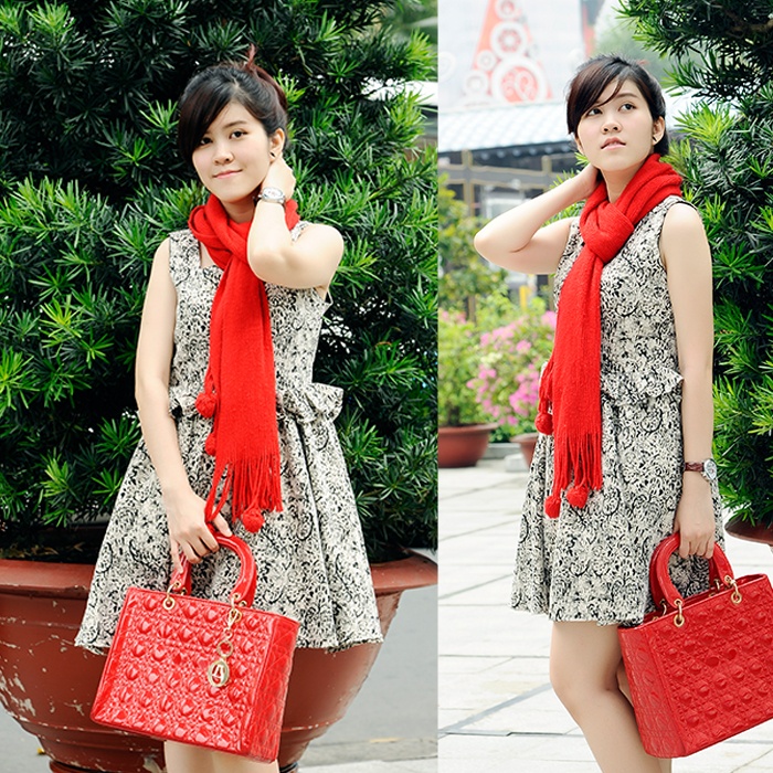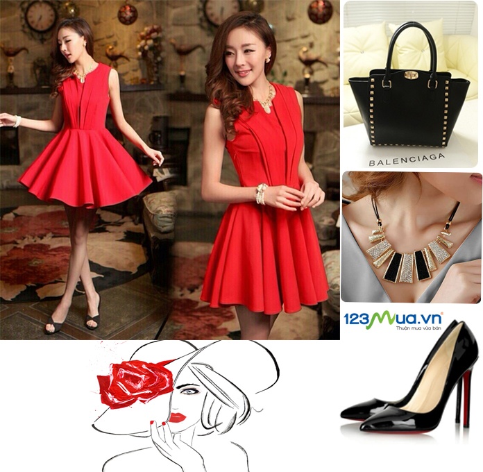 | Sưởi ấm mùa đông với sắc đỏ rực rỡ, chiếc đầm xòe xếp ly khéo léo khoe trọn các đường cong cơ thể của cô nàng quyến rũ. Chiếc đầm được bán giá 200.000đ. Để tạo sự sang trọng đi tiệc, cô nàng khéo kéo kết hợp cùng vòng cổ lấp lánh, đôi giầy cao bóng và chiếc tui đeo form to. |
