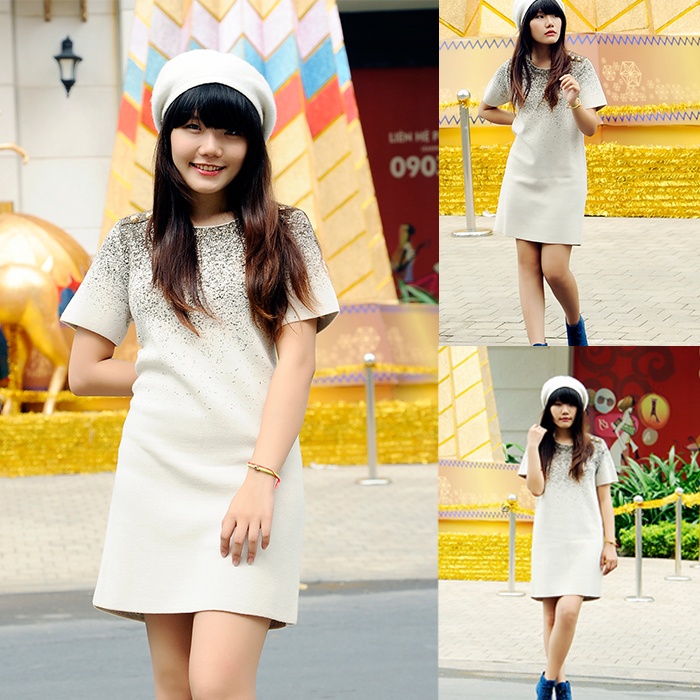 | Cuối tuần xuống phố dạo chơi, các bạn gái có thể chọn cho mình chiếc đầm xòe nhẹ chất liệu vải cao cấp phối kim tuyến giá 1.270.000 đồng. Chiếc đầm có nhấn bèo nhẹ phần eo và xếp pli giúp tạo độ phồng xoè, nữ tính. |