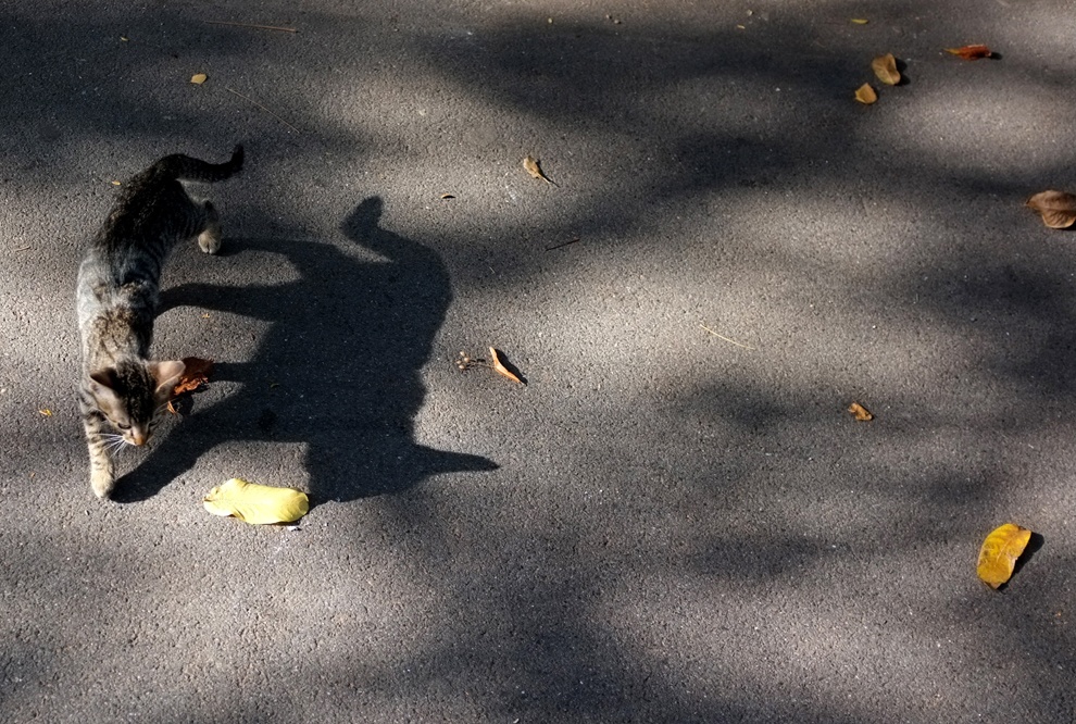 Chú mèo con đang đùa nghịch với chiếc lá và cái bóng của chính mình trên vỉa hè vào một ngày trời thu nắng đẹp ở Belgrade, Serbia.