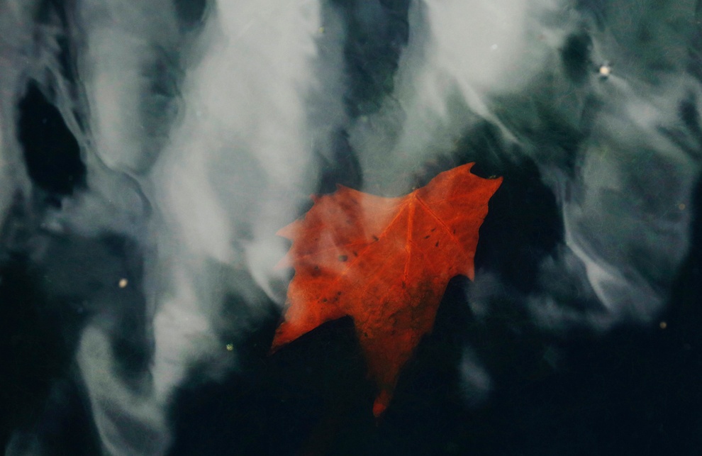 | Một chiếc lá thu đỏ rực chìm trong làn nước hồ tại công viên St James, London.   |