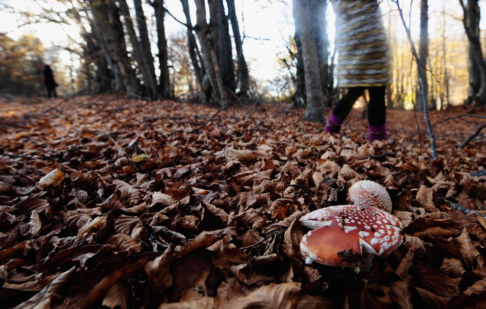 Những cây nấm "đổ rạp" dưới bước chân của một cô gái đi trong rừng vào ngày mùa thu ấm áp tại làng Mavrovo, Macedonia.