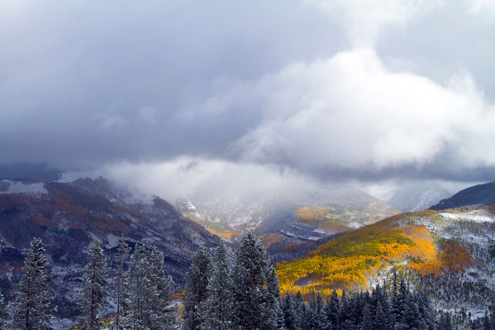 | Những tia nắng mặt trời làm nổi bật rừng cây Aspen đầy màu sắc, như thể chúng đang toả sáng giữa những đám mây trong một cơn bão tuyết.  |