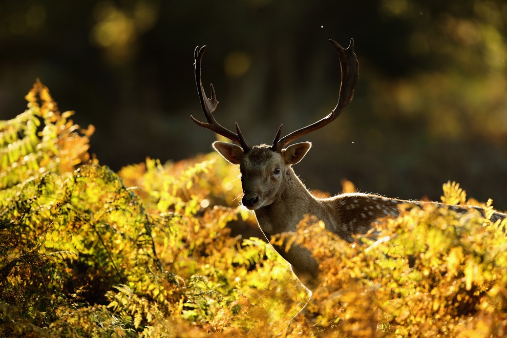| Một chú hươu vàng ngơ ngác giữa những cây dương xỉ mùa thu ở Altricham, Vương quốc Anh.   |