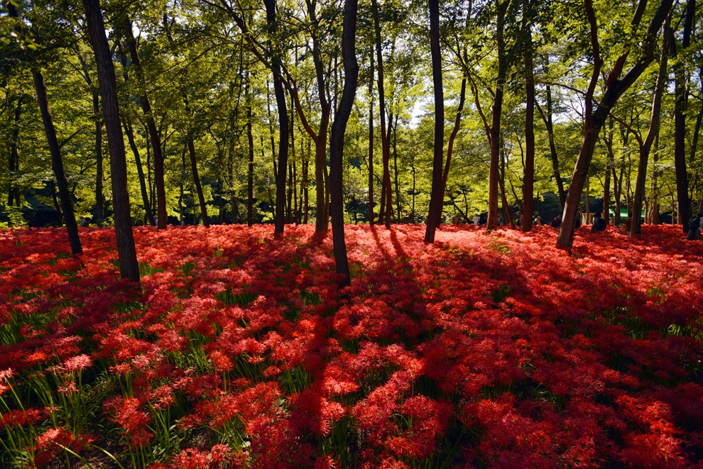 | Màu đỏ rực rỡ của những bông hoa loa kèn nhện đang nở rộ tại công viên Kinchakuda thuộc Hidaka, Saitama, gần Tokyo, Nhật Bản.   |