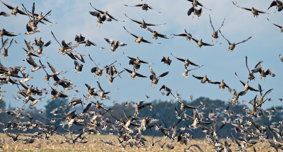 | Một đàn ngỗng trời vỗ cánh bay trong khung cảnh mùa thu ở Oderbruch, gần Sachsendorf, Đức. Chúng đang tranh thủ thích trữ năng lượng cho chuyến di cứ tránh rét sắp tới.  |