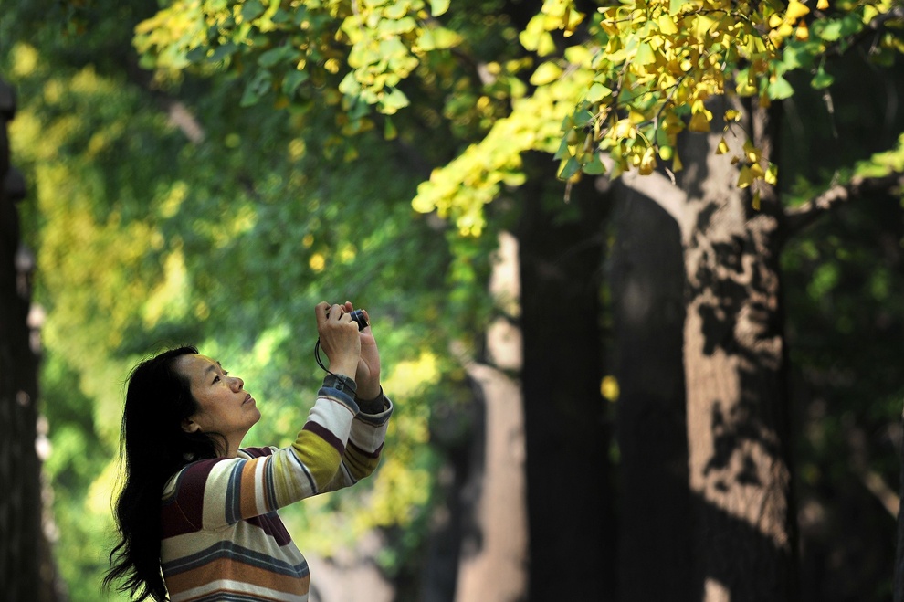 Một du khách đang chụp ảnh những chiếc lá của cây bạch quả tại Bắc Kinh. Mùa thu là mùa du lịch cao điểm của thành phố với số lượng du khách lên tới hàng chục ngàn người.