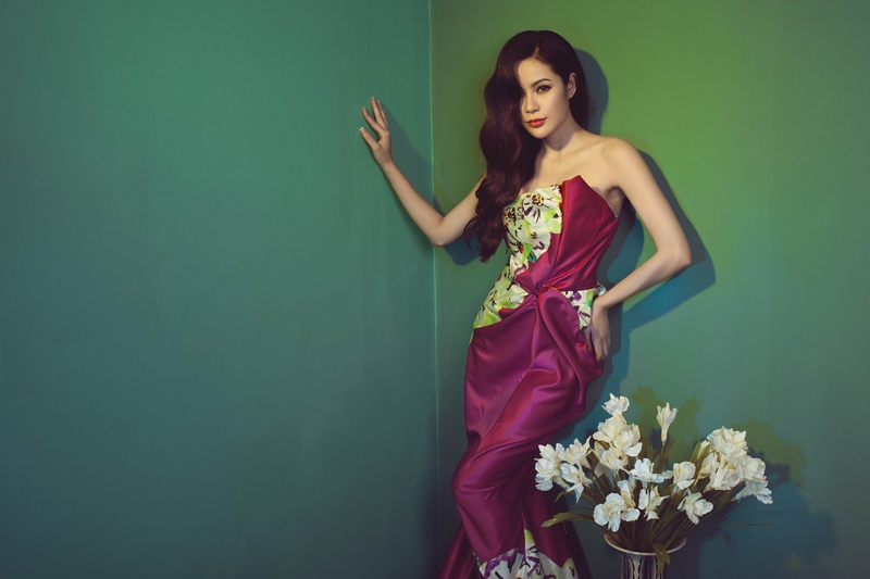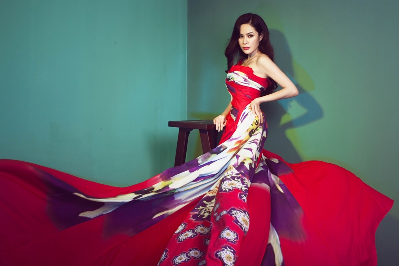 | Thiết kế của Châu Chấn Hưng mang đậm dấu ấn phương Đông với họa tiết in hoa lớn, gam màu ngọt ngào phù hợp vóc dáng châu Á. Victoria Phương Nguyễn là chọn lựa khá phù hợp với những mẫu váy nữ tính của anh. |