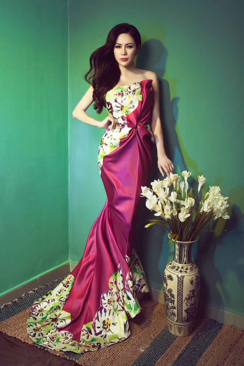 Những thiết kế dạ hội mùa thu có gam màu tươi trẻ và họa tiết lãng mạn góp phần tôn vinh vóc dáng yêu kiều của ''Hoa hậu châu Á tại Mỹ 2012''.