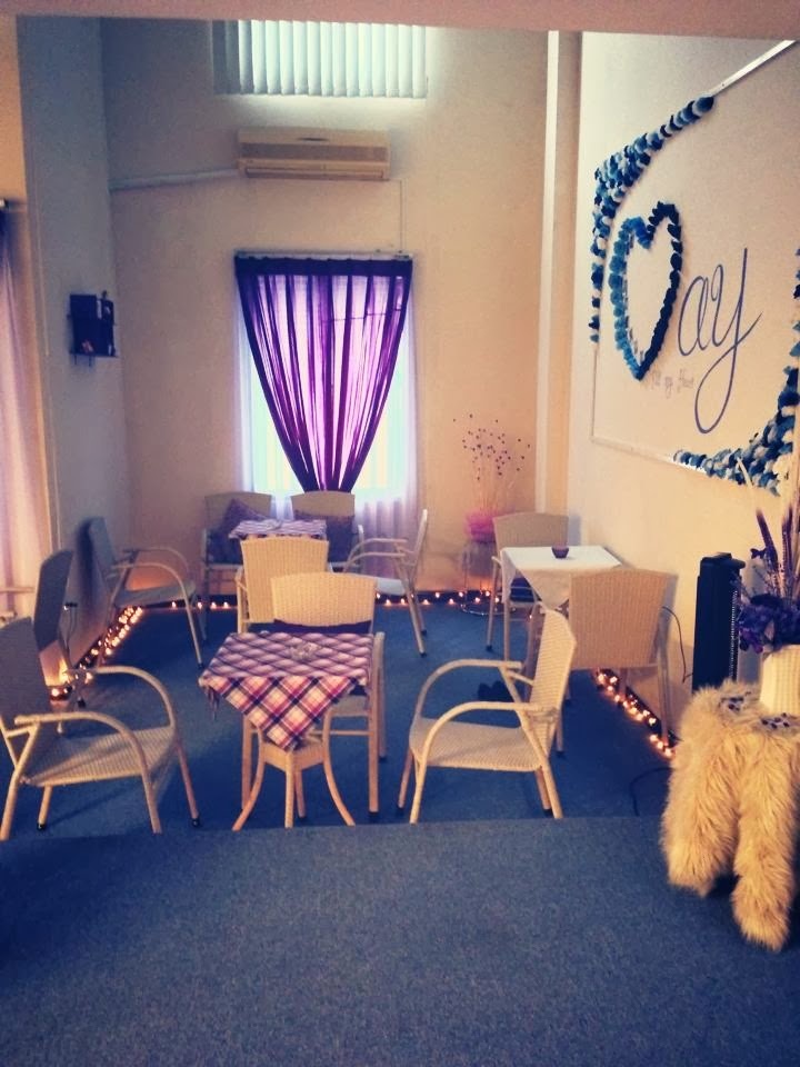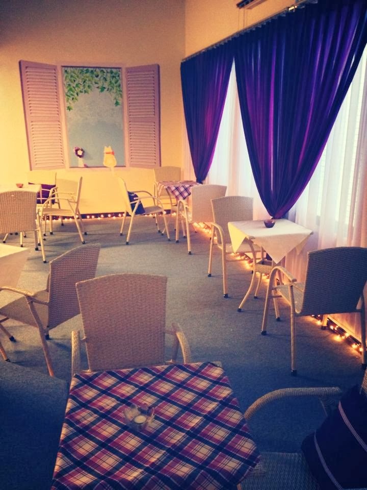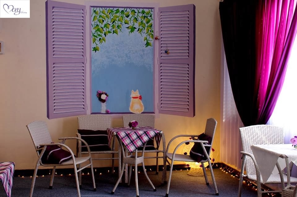 Tất cả các vật dụng, trang trí từ nhỏ nhất như hoa, mặt bàn, gối ngồi... đến những chi tiết lớn như rèm cửa, bức tường, bàn ghế... đều mang sắc tím nên không khó để thực khách nhận rõ tông màu chủ đạo của quán. Điểm đặc biệt là, dù chọn tông màu được mặc định mang đến cảm giác trầm buồn, lặng lẽ song với nghệ thuật sắp đặt, sự kết hợp tinh tế, không gian của quán không chỉ dịu nhẹ, trầm ấm mà còn mang đến những trải nghiệm khác hẳn. Dễ thấy nhất là cảm nhận trong từng góc ngồi.