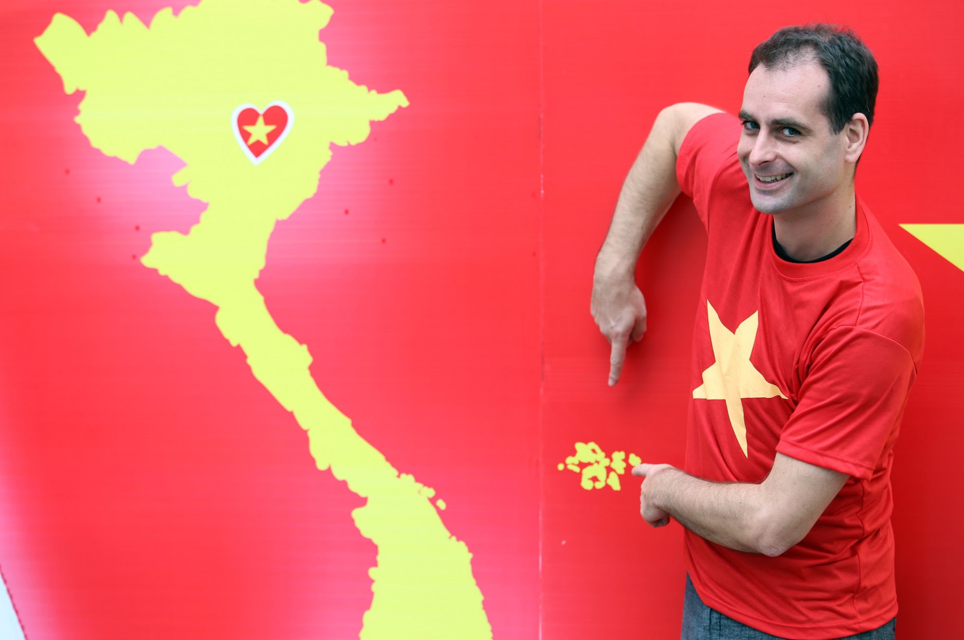 Tại điểm chụp ảnh Nhà văn hóa Thanh niên, Peter (một thanh niên Anh) chỉ vào tấm bản đồ tuyên bố: “Hoàng Sa- Trường Sa là của Việt Nam”.