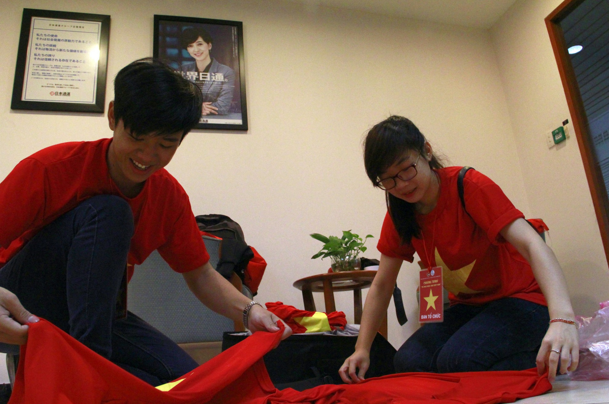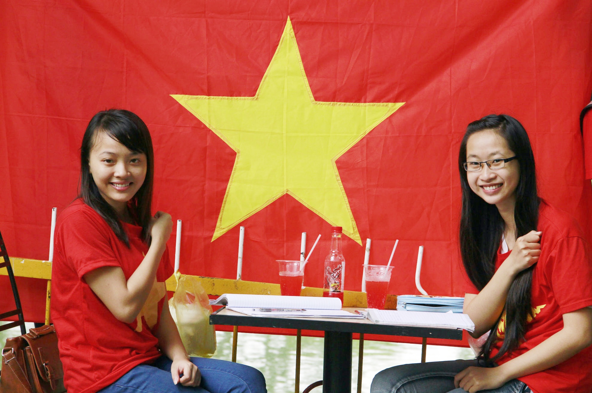 | Chương trình có tên "Tự hào ngôi sao Việt Nam". Mục đích quan trọng nhất là kêu gọi giới trẻ TP.HCM thể hiện tiếng nói riêng của mình về lòng yêu nước và tự hào dân tộc đồng thời nhắn nhủ “Yêu nước phải đúng cách, yêu nước phải văn minh”. Điều đặc biệt có sự tham gia hào hứng của rất nhiều người nước ngoài. Trong ảnh là hai bạn trẻ Dave và Timy (người Pháp) tại điểm chụp ảnh Nhà văn hoá Thanh niên TP.HCM. |