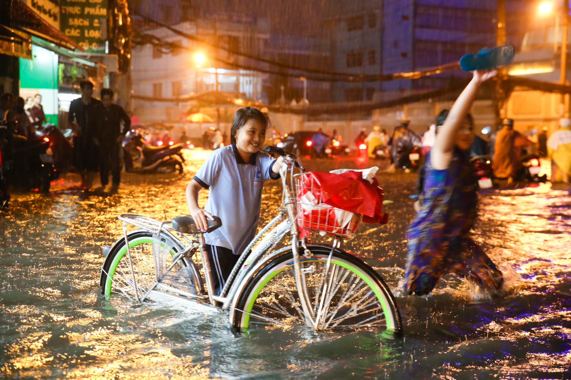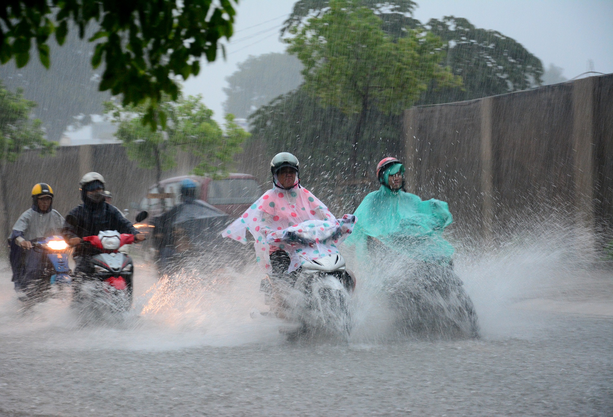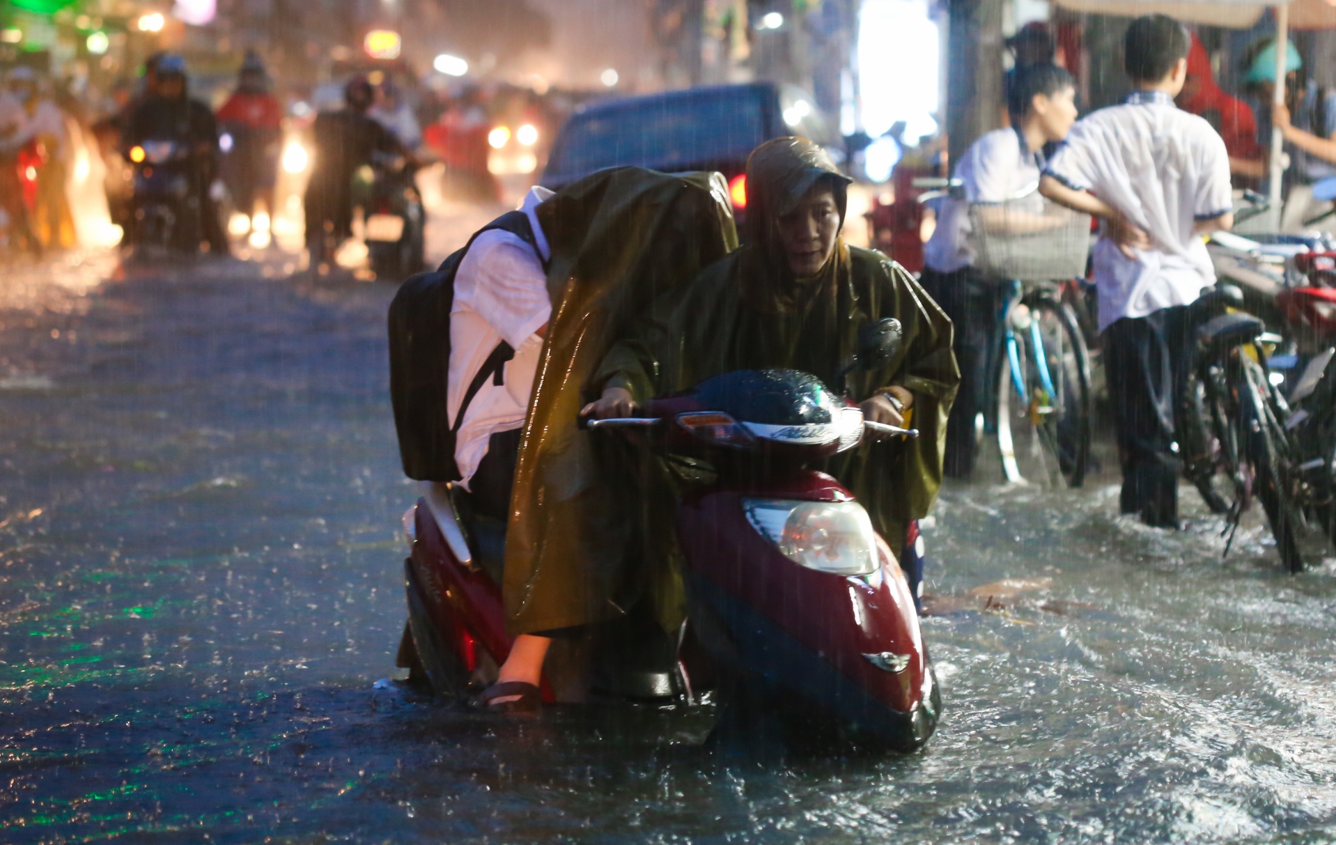 | Một người mẹ không lỡ để con phải lội nước đã cố gắng vượt sức cản để dắt xe chở đi trong mưa. |