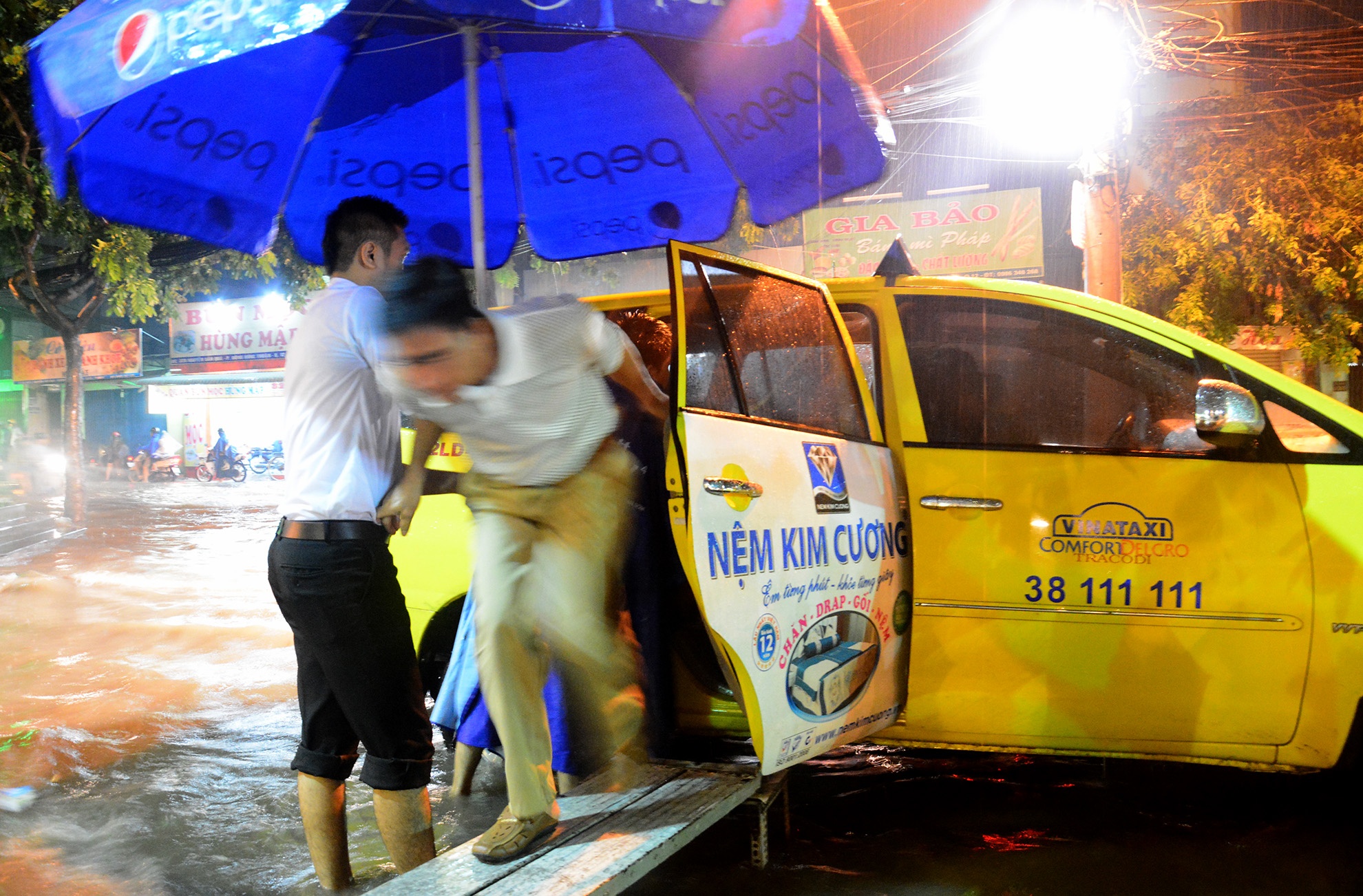 | Khách tới dự đám cưới tại một nhà hàng trung tâm thành phố phải lội nước bì bõm. |